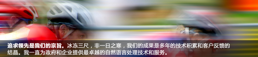 自從成立以來,我們?yōu)榭蛻籼峁└咝Ш椭悄芑男畔⑻幚砉ぞ吆妥稍兎?wù)。在這個(gè)信息爆炸的時(shí)代,如何讓互聯(lián)網(wǎng)上和企業(yè)內(nèi)部的海量信息為我們帶來更多的價(jià)值需要高度智能化的信息處理工具。我們提供的技術(shù)能夠高效并且準(zhǔn)確的對大量文本信息進(jìn)行處理、檢索、挖掘、翻譯等工作,并可方便地與信息系統(tǒng)的其他模塊進(jìn)行整合。